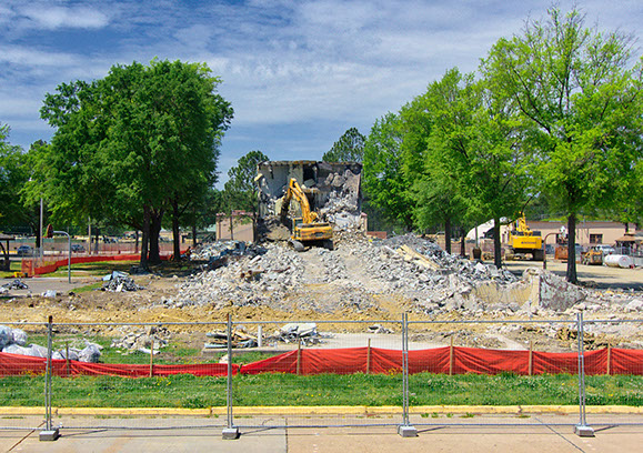 HEAVY DEMOLITION: This project consisted of heavy and select demolition of a former bowling alley, credit union, theater, science center and student dorms. Also, asbestos, lead & PCB removal, disposal and backfill was required. The work was executed safely and without issue while the campus remained open to the public during ongoing classes.