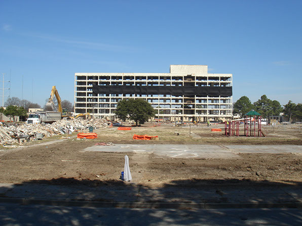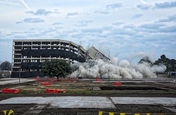 The job required an explosive detonated demolition of an 8 story apartment complex, including 19 additional apartment and community buildings, on a 20 acre site. The implosion of the larger mid-rise building comprised 94,000 square feet of demolition and clearing. This particular implosion was the first ever in the City of Hampton VA. All the materials remaining on site after the implosion and heavy demolition were recycled, paving the way for redevelopment of the property.