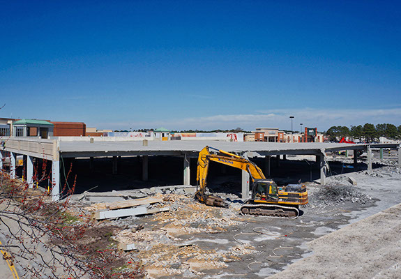 This job selectively deconstructed 89,000 square feet of a two-story parking garage, processing over 5,000 cubic yards of concrete. Concrete reinforced columns were removed, with 99% of the concrete (3,500 cubic yards) being crushed and processed on site for reuse. 5000 tons of recycled material was used as the underlayment for the new parking long. The entire scope of the work was performed while the mall stayed open, with no interruptions to mall services throughout the entire job.