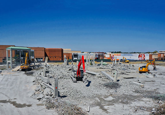 HEAVY DEMOLITION: The scope of work for this project included demolition, removal and disposal of approximately 110,060 sq ft of a two story school. Additionally, the project entailed removal and disposal of non-friable asbestos, as well as PCB contaminated materials. All concrete materials were salvaged and crushed on-site for reuse.
