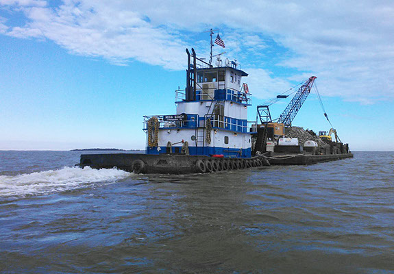 HEAVY DEMOLITION of Hog Island Coast Guard Station required transporting all heavy equipment and labor to the island on water by barge. After completion, all materials and debris was again removed by barge, leaving the coastline in a restored, environmentally pristine state.